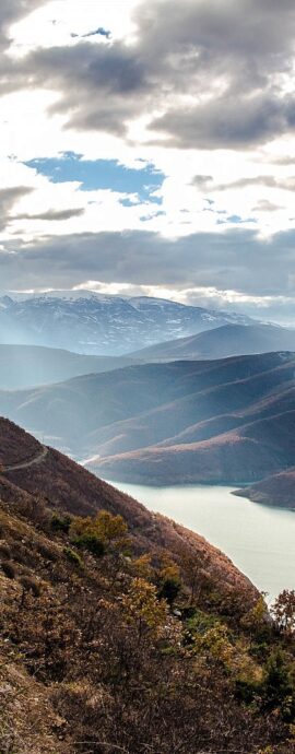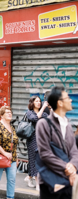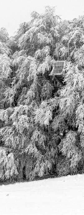 • A gray cat slinks past a wooden house. There’s something a little intimidating attempting to describe.
